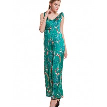 Black V Neckline Design Leopard Pattern Jumpsuit